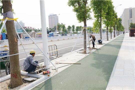 市區(qū)紅海東路東段升級改造工程的綠道、綠化帶已完工。圖為工作人員對該路段的新植樹木進行加固保護。