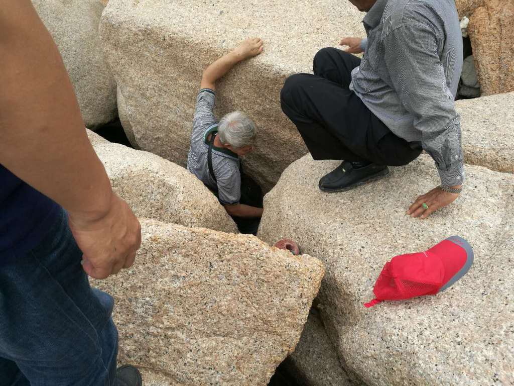 此次尋舊,陳先生和黃先生等伴我同時攀越海巖山石,探秘海盜頭領(lǐng)吳奇為躲避解放軍追捕隱蔽藏匿的水洞。