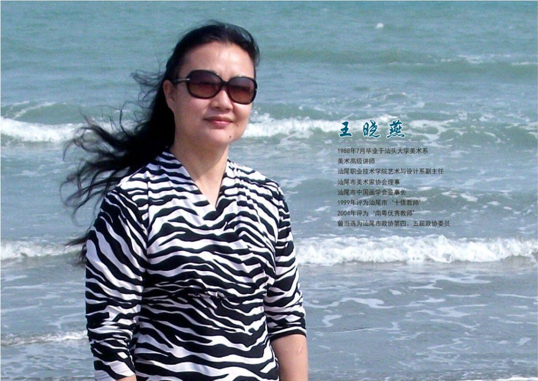 王 1988年7月畢業(yè)于汕頭大學(xué)美術(shù)系; 曉 美術(shù)高級(jí)講師; 燕 汕尾職業(yè)技術(shù)學(xué)院藝術(shù)與設(shè)計(jì)系副主任; 汕尾市美術(shù)家協(xié)會(huì)理事; 汕尾市中國(guó)畫學(xué)會(huì)監(jiān)事長(zhǎng); 1999年評(píng)為汕尾市“十佳教師”; 2004年評(píng)為“南粵優(yōu)秀教師”; 曾當(dāng)選為汕尾市政協(xié) 第四、五屆政協(xié)委員。 一、美術(shù)作品8件入選國(guó)家、省、市大型書畫展獲獎(jiǎng)及被收蕆: ★ 水彩人物作品《讀》1995年入選“95中國(guó)女書畫家作品邀請(qǐng)展”并被收藏; ★ 水彩作品《泊》、《只爭(zhēng)朝夕》分別入選汕尾建市10周年、20周年大型書畫慶展被收藏; ★ 拼貼畫《協(xié)力》2014年3月獲廣東省“女工巧手夢(mèng)繪南粵”一等獎(jiǎng); ★ 拼貼畫《時(shí)裝秀》2014年3月獲廣東省“女工巧手夢(mèng)繪南粵”優(yōu)秀獎(jiǎng); ★ 水彩作品《我在捉迷藏》2015年7月獲廣東省“牽手你我,攜夢(mèng)人生”書畫創(chuàng)作活動(dòng)優(yōu)秀獎(jiǎng); ★ 水彩作品《凝望》2015年11月入選“廣東省首屆高校學(xué)院獎(jiǎng)雙年展”; ★ 水彩作品《歲月》2017年7入選“深莞慧+河源汕尾”五市連展。