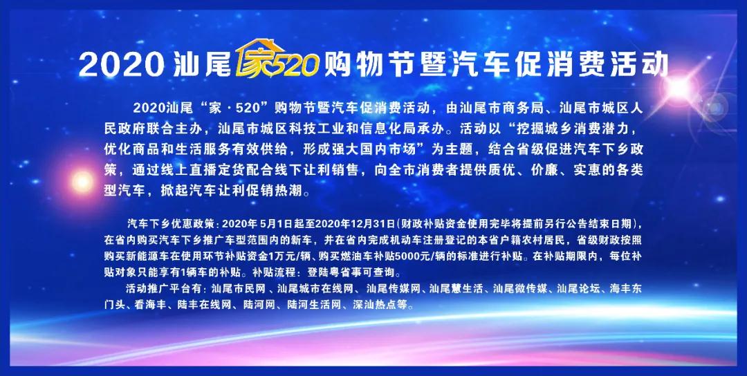 由汕尾市商務(wù)局、汕尾市城區(qū)政府主辦,汕尾市城區(qū)科技工業(yè)和信息化局承辦,汕尾市民網(wǎng)、汕尾市網(wǎng)商協(xié)會(huì)協(xié)辦的——2020汕尾“家·520”購(gòu)物節(jié)暨汽車促消費(fèi)活動(dòng)將于5月20日上午10點(diǎn)隆重開(kāi)幕。 2020汕尾“家·520”購(gòu)物節(jié)暨汽車促消費(fèi)活動(dòng)以“汽車消費(fèi)帶動(dòng)提升居民消費(fèi)能力,形成強(qiáng)大國(guó)內(nèi)市場(chǎng)”為主題,結(jié)合省級(jí)促進(jìn)汽車下鄉(xiāng)政策,通過(guò)線上直播定貨配合線下讓利銷售,向全市消費(fèi)者提供質(zhì)優(yōu)、價(jià)廉、實(shí)惠的各類型汽車,全方位激發(fā)汽車消費(fèi)潛力。 促銷活動(dòng)啟動(dòng)儀式將在市區(qū)玉臺(tái)山慈云公園廣場(chǎng)舉行,汕尾十七家汽車銷售公司同時(shí)舉行,屆時(shí)將有奔馳、奧迪、別克、大眾、豐田、比亞迪、吉利等多種熱門(mén)車型打折讓利銷售。購(gòu)車者到其中任意一家門(mén)店購(gòu)車,都能享受到折扣優(yōu)惠。 一、活動(dòng)名稱 2020汕尾“家·520”購(gòu)物節(jié)暨汽車促消費(fèi)活動(dòng) 二、活動(dòng)時(shí)間 2020年5月20月-7月31日 啟動(dòng)儀式20日上午10:00時(shí) 三、活動(dòng)地點(diǎn) 汕尾市市區(qū)玉臺(tái)山慈云公園廣場(chǎng)(啟動(dòng)儀式) 四、組織單位 (一)主辦單位:汕尾市商務(wù)局、汕尾市城區(qū)政府 (二)承辦單位:汕尾市城區(qū)科技工業(yè)和信息化局 (三)協(xié)辦單位:汕尾市民網(wǎng)、汕尾市網(wǎng)商協(xié)會(huì) 五、活動(dòng)推廣平臺(tái) 汕尾市民網(wǎng)、汕尾城市在線網(wǎng)、汕尾傳媒網(wǎng)、汕尾慧生活、汕尾微傳媒、汕尾論壇、海豐東門(mén)頭、看海豐、陸豐在線網(wǎng)、陸河網(wǎng)、陸河生活網(wǎng)、深汕熱點(diǎn)等 六、汽車參展公司 汕尾駿榮汽車、汕尾市君樂(lè)汽車、汕尾中溢豐田汽車、汕尾廣物福恒汽車、汕尾錦虹汽車、汕尾信德行汽貿(mào)、汕尾中升恒通汽車、汕尾廣物汽車、汕尾市啟信汽車、汕尾廣物君豪汽車、汕尾中銘汽車、汕尾東潤(rùn)汽車、汕尾廣物東本汽車、汕尾中悅汽車、汕尾市寶榮汽車、汕尾市永駿汽車銷售服務(wù)有限公司、汕尾市捷晟汽車有限公司 敲黑板。。 力度空前的購(gòu)車優(yōu)惠政策 購(gòu)車最高補(bǔ)貼資金1萬(wàn)元/輛 助您輕松成為有車一族 ☟☟☟ 2020年5月1日起至2020年12月31日(財(cái)政補(bǔ)貼資金使用完畢將提前另行公告結(jié)束日期),在省內(nèi)購(gòu)買(mǎi)汽車下鄉(xiāng)推廣車型范圍內(nèi)的新車,并在省內(nèi)完成機(jī)動(dòng)車注冊(cè)登記的本省戶籍農(nóng)村居民,省級(jí)財(cái)政按照購(gòu)買(mǎi)新能源車在使用環(huán)節(jié)補(bǔ)貼資金1萬(wàn)元/輛、購(gòu)買(mǎi)燃油車補(bǔ)貼5000元/輛的標(biāo)準(zhǔn)進(jìn)行補(bǔ)貼。在補(bǔ)貼期限內(nèi),每位補(bǔ)貼對(duì)象只能享有1輛車的補(bǔ)貼。補(bǔ)貼流程:登陸粵省事可查詢。 極具吸引力的購(gòu)車優(yōu)惠 心動(dòng)不如行動(dòng) 家·520,為愛(ài)發(fā)聲 給予家人一份讓他們驚喜的禮物吧 |